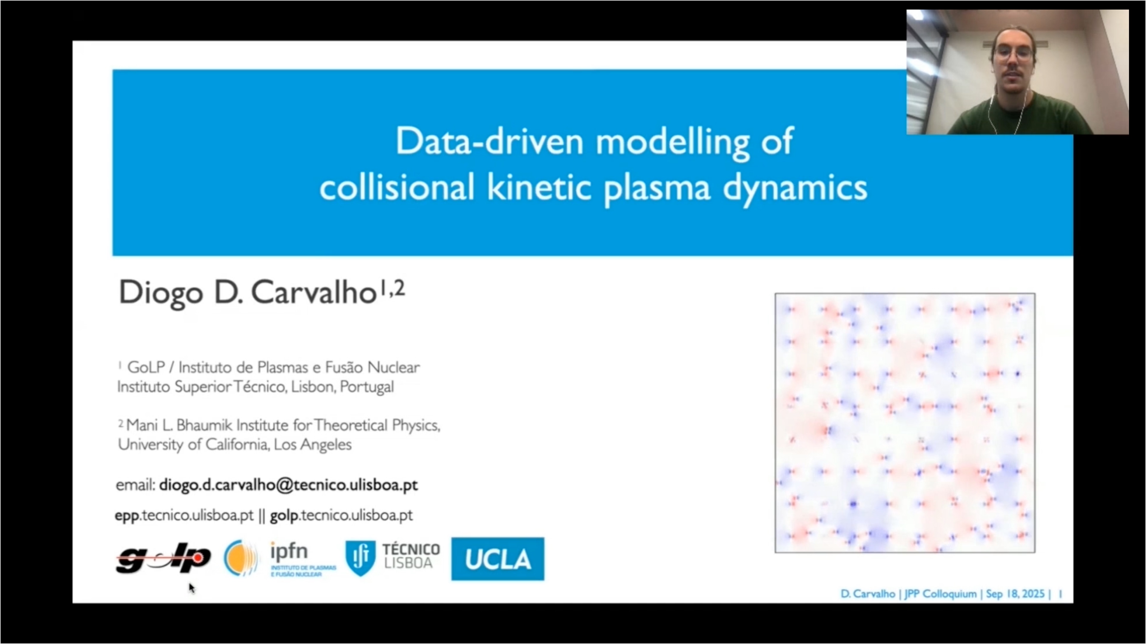 Diogo C delivered the JPP Frontiers of Plasma Physics Colloquium on September 18 2025 showcasing his most recent results on "Data-driven modelling of collisional kinetic plasma dynamics". Video available here